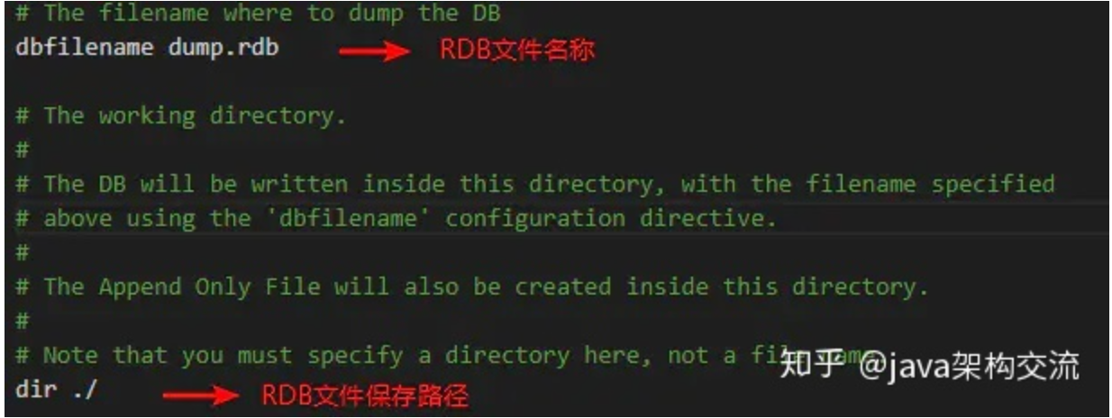 生成的RDB文件会根据Redis配置文件中的名称和路径来保存,相关的2个配置如下所示: